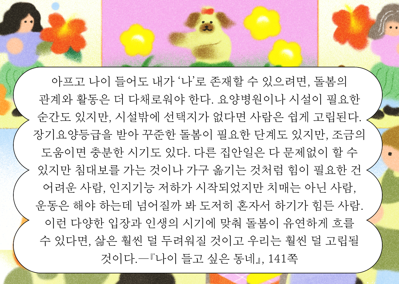 『나이 들고 싶은 동네』에 나오는 사람들은 지역을 거점으로 서로를 돌보고 돌봄 받는 ‘돌봄의 생태계’를 이뤄냅니다. 이들은 함께 운동하며, 나답게 살아가고 죽기 위한 대화를 나눕니다. 아픈 이웃은 돌아가며 함께 돌보고, 인지증 당사자도 쉬어갈 수 있는 마을 카페를 운영합니다. 당장 이들처럼 실천하고 싶지만 이런 물음이 머리에 떠오르는 분들도 있을지 모르겠어요. ‘살림의료복지사회적협동조합 같은 돌봄 공동체가 없는 동네에서는?’ ‘내성적인 사람도 돌봄 공동체를 꾸리거나 속하려면?’(곧 열리는 북토크에서 이 질문에 대한 답을 얻어가세요! 자세한 내용은👇👇😏👇👇)