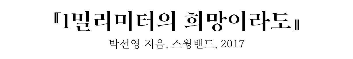 "박선영"이라는 이름에 《한국일보》에서 공개될 때마다 뜨거운 반응을 불러모았던 명칼럼들을 떠올리는 분들도 계시겠지요? 「가난해서 죄송합니다」, 「따뜻한 개천으로 내려오든가」, 「도라에몽은 울지 않는다」 등등…… 『1밀리미터의 희망이라도』는 그 칼럼들에 살을 더하여 엮은 칼럼집입니다. 시의성이 중요한 일간지의 성격상 언급되는 몇몇 사건들은 이제 다 지나간 얘기로 느껴질 수도 있지만, 그것들을 입구 삼아 들어가 기술, 빈곤, 노동, 교육, 젠더 이슈에 대해 논하는 대목들을 보면 어쩜 지금도 구절구절 들어맞는지 놀라게 됩니다.