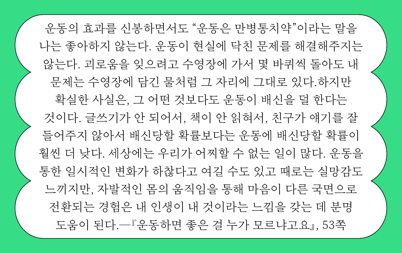 "내 삶에 꼭 맞는 체력을 찾는 것이 중요하다. 무한의 체력이 아니라, 나의 일상을 위한 체력을 키우고 가꾸는 것이 정확한 목표다."—71쪽